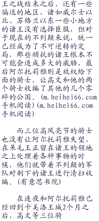 并不是所有不列颠独立王国都选择了对抗阿尔托莉雅所代表的不列颠王室,除了那些在反王之战落败的诸王,还有着一些没有参与反王之战的诸王选择了臣服,这些之中就有高文等骑士和格尼薇儿公主等人的国家。