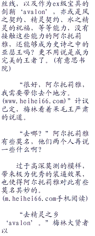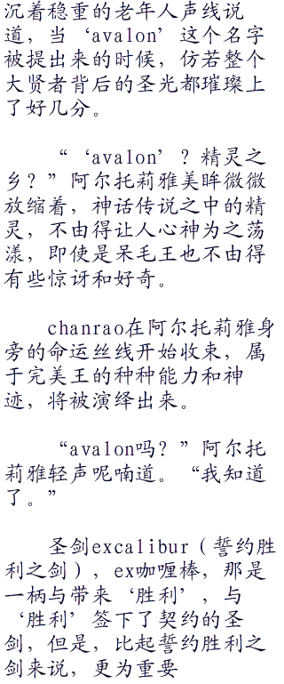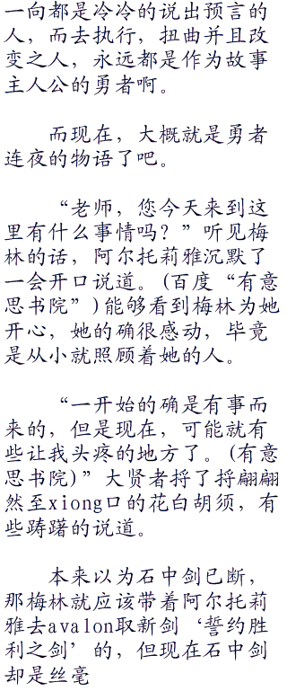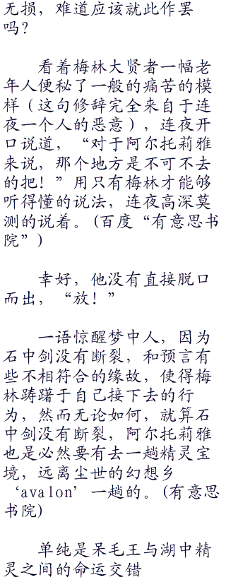 “啊?没什么,只是,稍微有点吃惊的罢了。”回过神来的梅林看对疑惑着的呆毛王说道。