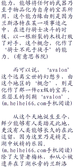 在阿瓦隆之中,有着一片看不到边的湖泊,远远看去就仿佛一面镜子般光滑透彻,闪烁着粼粼波光。湖水异常的清澈,折射着太阳的璀璨光华,但诡异的是怎么也看不到湖底风光,此乃谓之‘无毁的湖光’,亦即‘闪耀的阿隆戴特’,由此概念演化出来的精灵圣剑,即为第一骑士兰斯洛特手中的那把‘无毁的湖光’。