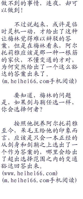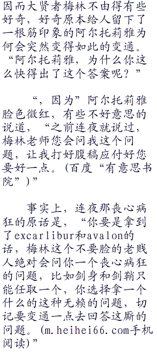 仿若是已经在心底打了腹稿一般,虽然规避了单纯的剑身与剑鞘的选择题,但是却极好的展示出了阿尔托莉雅不同于亚瑟王史诗之中的那一个只懂得剑刃之锋利,而不懂得剑鞘的守护的亚瑟王之处。