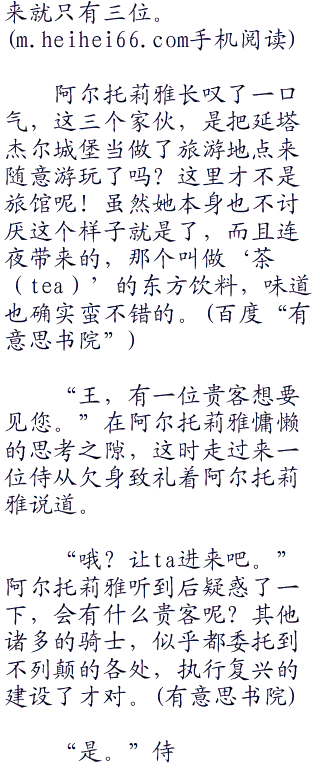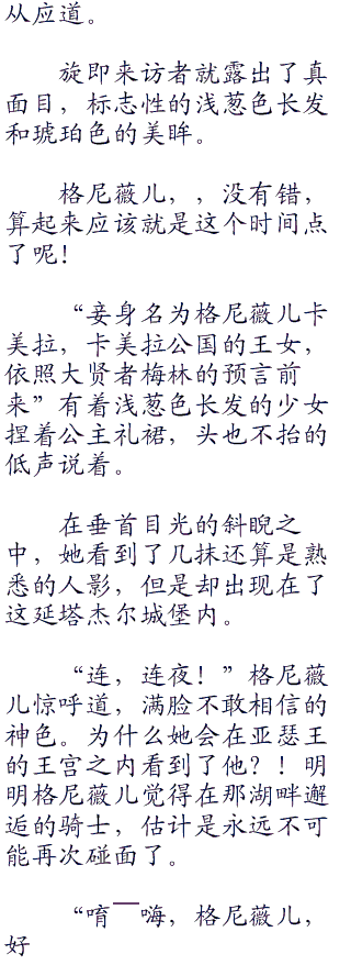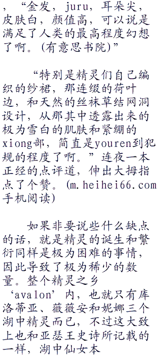“所以说,骑士大人,湖中精灵长得是什么样子的呢?很漂亮吗?是厉害的仙女吗?”听闻‘avalon’之行,竟然是遇见了真正的湖中仙女什么的,这一点让尤斯蒂娅一下子就充满了向往。