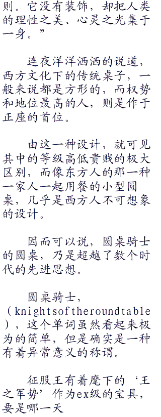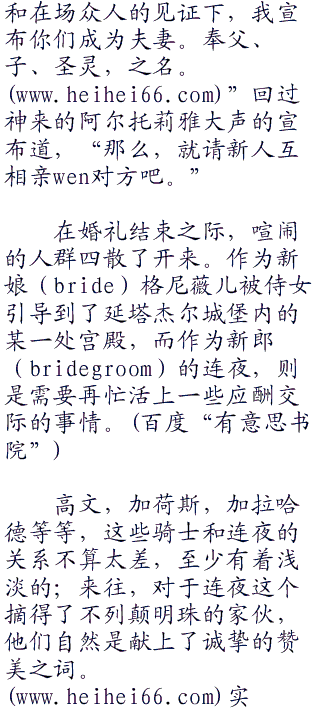 很难说这个亚瑟王创造着奇迹的架空不列颠时代,是否有着已经成型了的西方式婚礼过程,那种‘你是否愿意嫁给这个男子,按照圣经的教训与他同住,在神“零零零”面前和他结为一体,爱他、安慰他、尊重他、保护他,像你爱自己一样。不论他生病或是健康、富有或贫穷,始终忠於他,直到离开世界。’这样子的问话,以及‘yes,ido’的肯定答案。