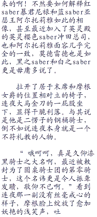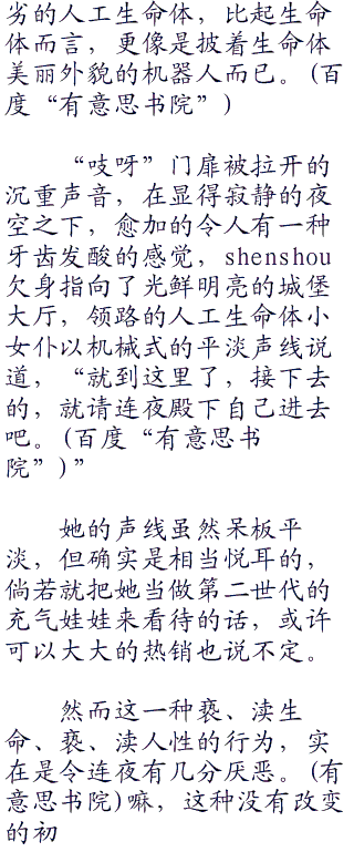 期间之区别,大概就在于是否能够把人工生命体做的具有自由的人性这一点了。像爱丽斯菲尔这样子的精致人工生命体,又有着虽然笨拙,但是自由而鲜活的思想,就堪称是臻至完美的人工生命体了;而像那一种可以随时被作为魔术的待机而摧毁掉的,没有思想,只能够凭借着预先设置好的术式进行僵硬的动作方式的,就只是机器人+充气娃娃的结合体罢了,可以说是炼金术方面的败笔之作。