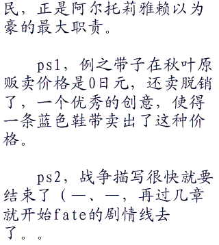至于那条蓝色的迷之丝带,例之带子最终连夜也是没有好意思把它送给阿尔托莉雅当做生日礼物,最终是被他拿来当鞋带用了。