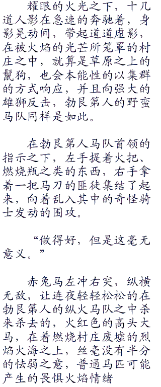 呈现在连夜眼前的,那片平原地区的盘扎宿居的农舍很快被火焰所席卷了,滔滔的烈焰向着天空逐渐的翻腾着噬人的火舌,漆黑的烟幕之下,是陷入了混乱的人群以及沉重的咳嗽声。当然,掩盖了这一切的,则是一些恶劣匪徒那如同夜枭一般的谑笑声,他们,在享受着劫掠平民的快感,以及纵火的肆意。