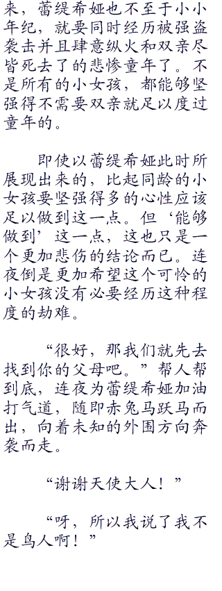 不过虽然这个金发的小幼女姑且还算是冷静,没有像普通的七八岁小女孩那般,会给连夜添上不小的乱子,照顾小女孩还是很让人头疼的事情。