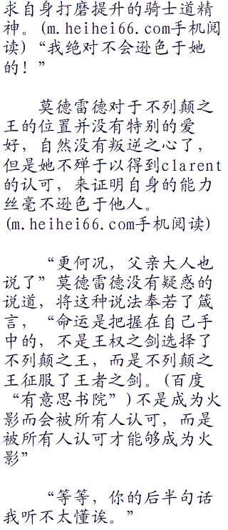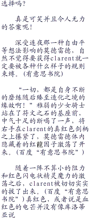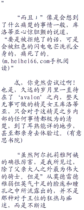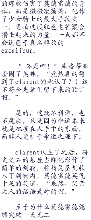 “我说,clarent的话,还是不要尝试了吧,选择其它的圣剑吧,小莫德雷德。”库洛蒂亚好心的劝说道,“无法被认定为不列颠之王的人,是没有办法得到这柄精灵圣剑的认可的,这是精灵种流传下来的规则束缚。