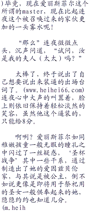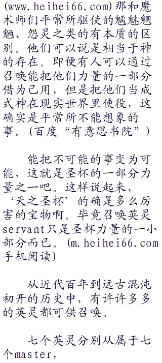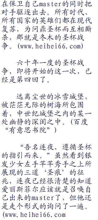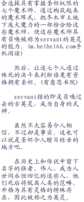 从那以后,以六十年为一个周期,圣杯会再次出现在曾经被召唤的极东之地冬木市。然后圣杯