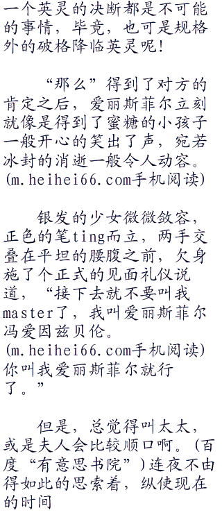 “如你所愿,ster。”连夜欠身致礼道,对于爱丽斯菲尔还郑重其事的、小心翼翼的问了第二遍的样子感到十分的好笑。