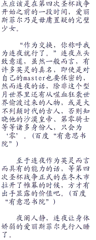 想来爱丽斯菲尔作为人工生命体,会被束缚在爱因兹贝伦家城堡之中的阻力,也就只有爱因兹贝伦家族的那些掌权者罢了。但纵使是久负盛名的魔术‘御三家’家族,要想反对连夜这样