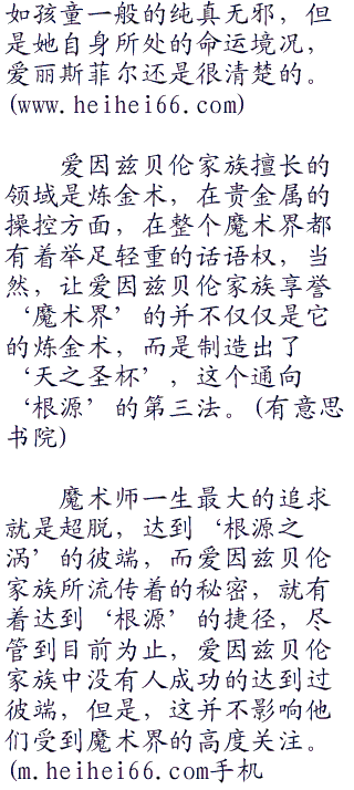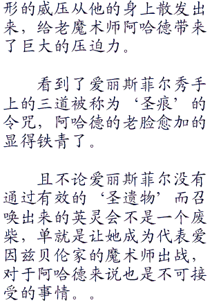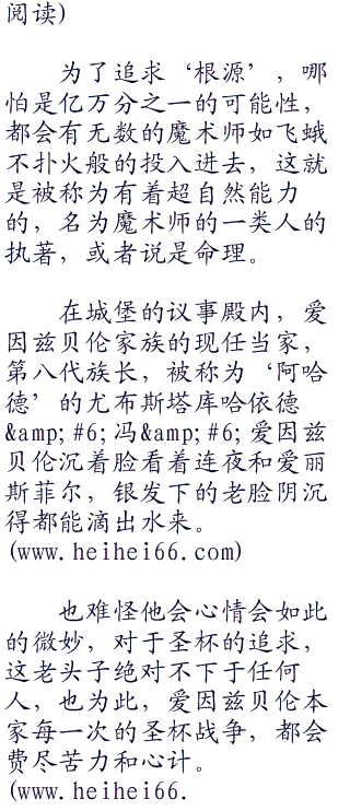 城堡的主人,有着享誉‘魔术界’的荣耀之姓氏,爱因兹贝伦,家统源远流长的魔术家族。