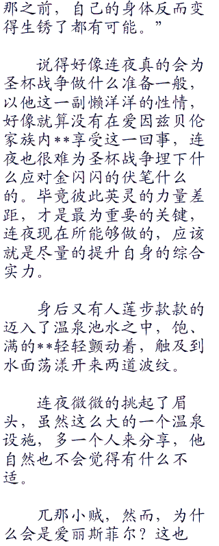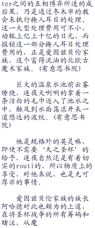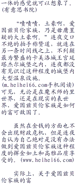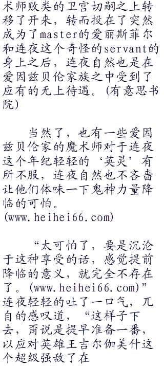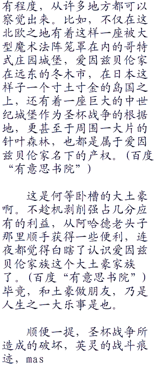 “说起来,爱因兹贝伦家的这群土豪魔术师们,还真是懂得享受啊。”看着眼前的景象,连夜不由得轻叹道。