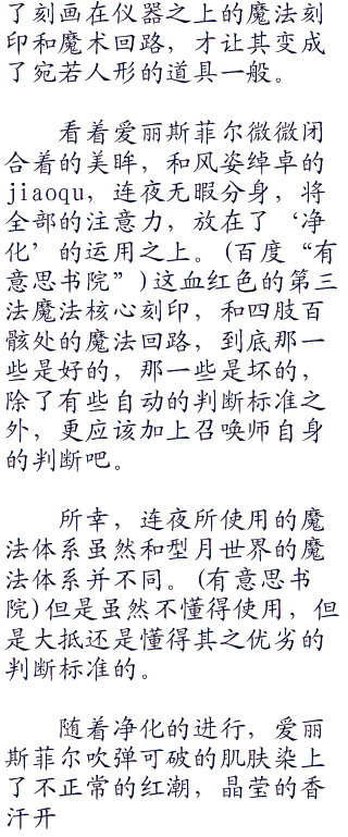随着‘净化’的光芒进入体内,爱丽斯菲尔身上逐渐浮现了一道道颜色各异的魔法刻印,除了