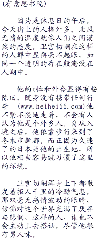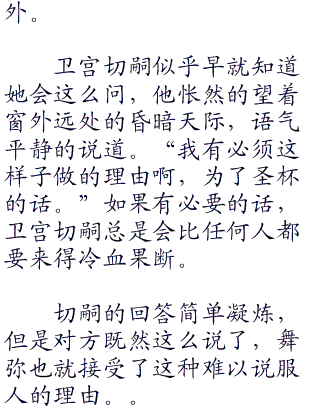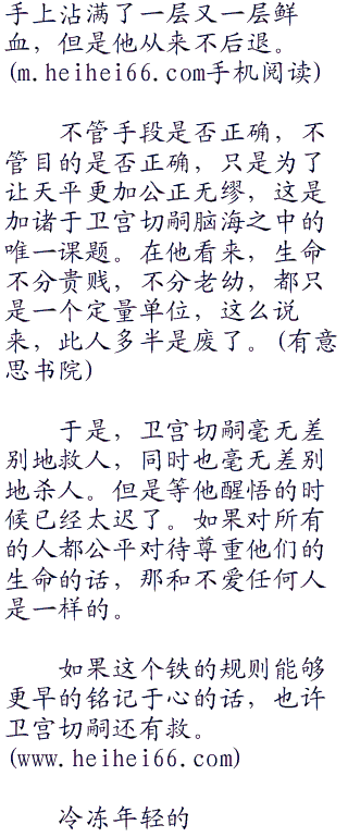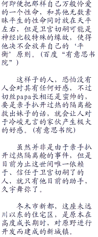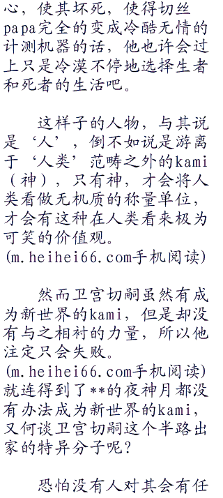 “零零零” 但是那个切丝papa不一样。也许是因为他比任何人都愚蠢吧。也许他哪儿坏掉了吧。又或许他是那种可以被称之为圣人,背负着常人无法理解的天命的人吧。领悟到这个世界上的所有生命都会被放在牺牲和救赎两个天平上进行称量,明白了绝不能让任何一边的托盘空着。
