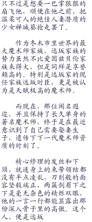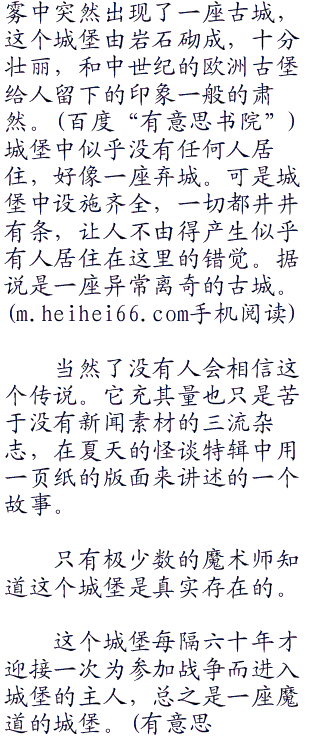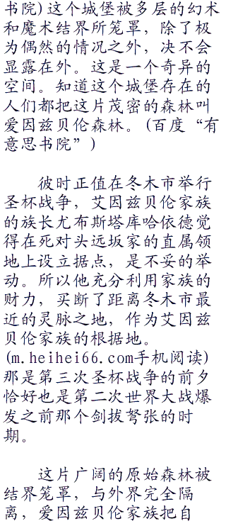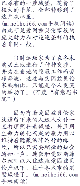 当然,这个都市传说某种意义上只是一个无聊的怪谈。虽说这片森林尚未有人开发,可是从冬木市区驱车不到一个小时便可抵达这里。如果真的有一座那么奇异的城堡的话,一定会众人皆知。实际上,过去也曾经有人数次在这片原始森林进行土地测量,可是一次也没有发现过人工建筑物的痕迹。