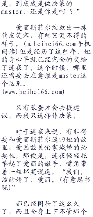 “爱丽丝菲尔,你是属于我的公主,是我的女人,从我们签订契约的那一刻开始,你就注定是属于我一个人的,谁都没有资格将你抢走,你必须有这样的自觉!”