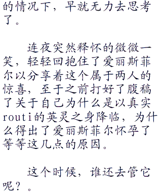 但是,继承了爱丽丝菲尔&a;a;#6;冯&a;a;#6;爱因兹贝伦之名的她,终究要面对家族所给的使命,那是逃避不了的命运枷锁,对她来说,这些年的幸福生活,已经是她最大的满足了。更何况,她手背的三枚圣痕令咒,以及对于她来说密不可分的servant连夜,早就说明了她是无法逃过圣杯战争这一点的。