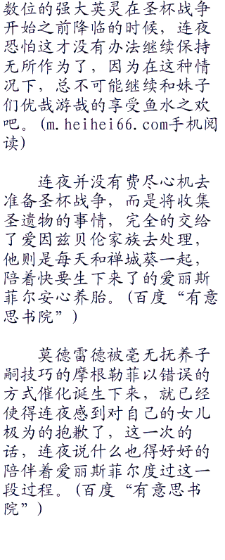 再接下来,各大魔术师势力,为了圣杯战争做好了极为妥善的准备的时候,连夜仍然保持着无所作为,因为他还有那么多妹子的女儿需要去处理,哪里有时间跟他们一样,为了一个被污染了的破杯子准备那么久。