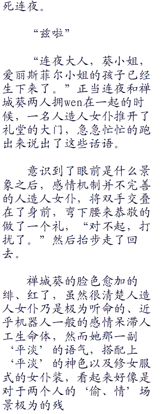 这并不可笑,也丝毫不显得懦弱。相反的,在禅城葵看来,连夜的一个特点,远远比起那些可以用价值大小的权重来丈量亲人性命的魔术师要来得耀眼得多了。禅城葵的想法也是如此,假若成为了母亲,生下了孩子,必然是会以一种战战兢兢地的心理,好好的将彼抚养长大。