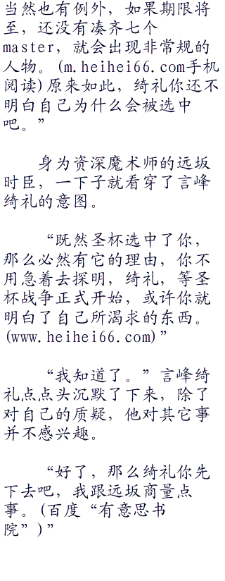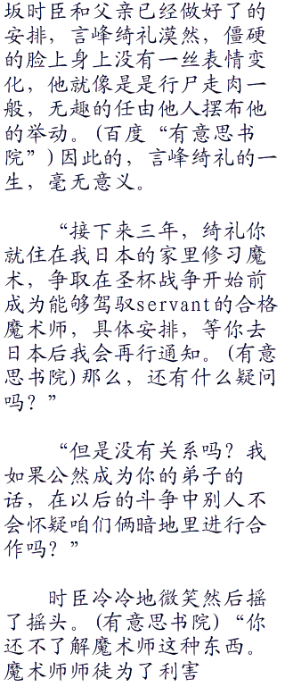 “就是这样。”到了这个时候,远坂时臣的嘴角露出了一丝微笑。结盟的结果,就是原本的不确定情况,变成了的确定性情况,这对于远坂时臣来说,自然是足以使其感到高兴的事情结果。“当然了,表面上我们应该仍是敌人,但暗地里却由你协助,我们合力将其余五位ster解决。为此,绮礼,你将以派遣的方式,从教会转入魔术协会,成为我门下的弟子。”