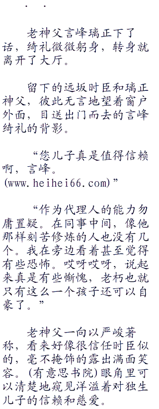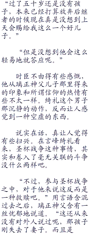 “没错,正式的文件也已经下来了。”璃正神父这样说完,递过来一篇公文。由圣堂教会和魔术协会共同署名,写着言峰绮礼收的通告文书。办事效率如此之高,这才两天的功夫,事情已经飞速进展到这个程度了。
