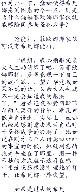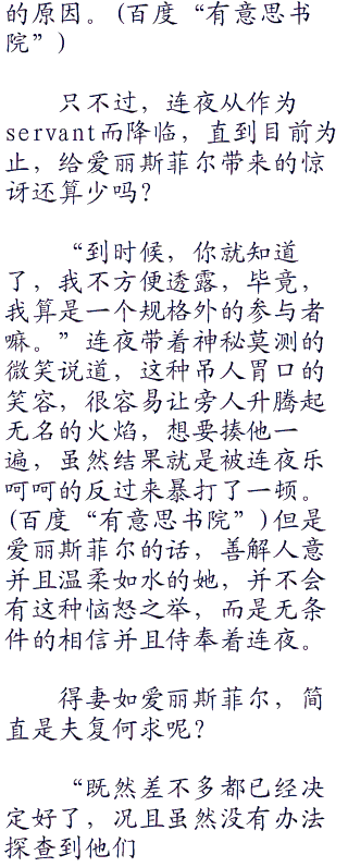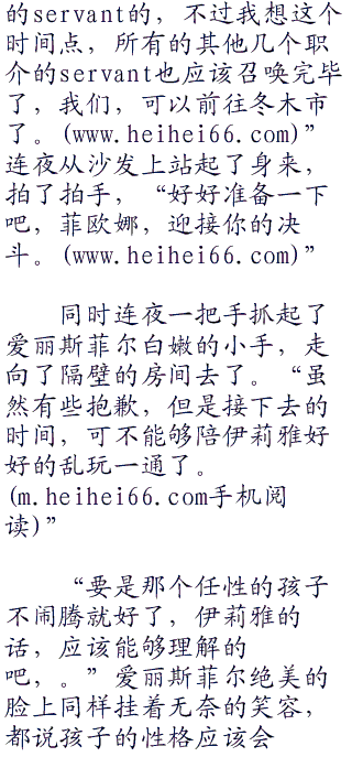 “不,还有两个。”连夜沉吟道,“只不过那两个莫名其妙的参与到了圣杯战争其中的人,自己都没有意识到他们加入了什么样子波澜壮阔的格局吧。”连夜所指的,就是窃取了导师的圣遗物而参与了圣杯战争的韦伯&a;a;#6;维尔维特,以及那个就连自己也不清楚为什么加入了圣杯战争其中的变态杀人鬼雨生龙之介。在凑不齐其余7人ster的情况之下,就算是雨生龙之介和韦伯这种魔术水准并不算太高的魔术师,也得以被恶意满满的‘天之圣杯’拉到了圣杯战争的系统当中。