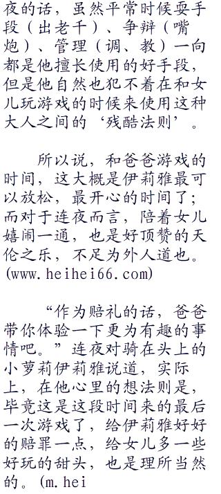 但是你要清楚,连夜所可以展示出来的,大人世界的险恶做法,是为了让伊莉雅深刻的明白社会的残酷性,这是连夜在一本正经的教育自己的女儿,实