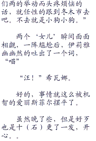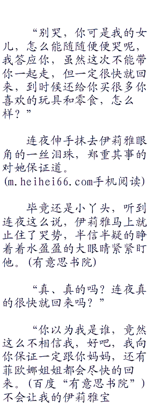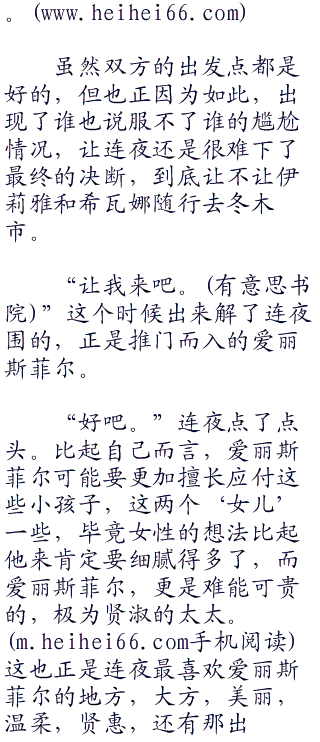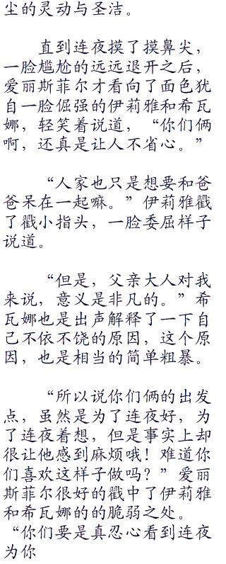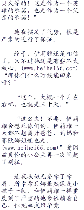 伊莉雅作为一个还没真正长大的孩子赖着人姑且不论,希瓦娜的身体虽然从各种意义上都已经成长得足够的卓越了,但是她的战斗智商或者说是战斗本能远远的超过的了常人,反过来她的情商估计并不会比伊莉雅来得高。所以希瓦娜现在这种对于连夜的眷念,是誓死护卫在父亲大人身边的想法,何尝不能够当做幼long对于父亲的眷恋之情。