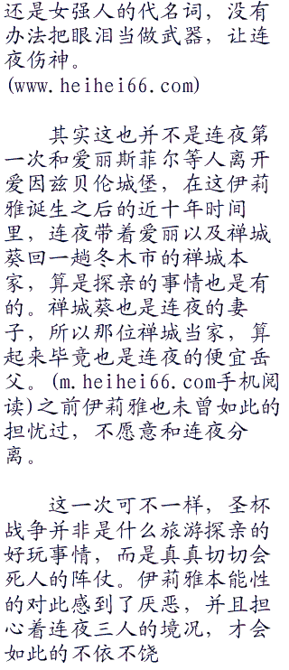 只不过,连夜依旧是把回答咬得死死得不更替,“伊莉雅,希瓦娜,你们俩就和小葵一起,待在爱因兹贝伦城堡,等待我和爱丽、菲欧娜返回就行了。”