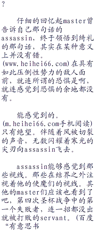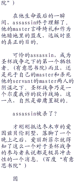 在空中显现的有剑,有矛,有无数种类,却又互不重复,而其中任意一样都是有着绚烂装饰的宝物般的“零零零”武器。并且这所有武器的矛头所指,都是向着assassin。