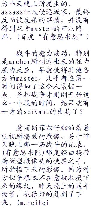 和那样的家伙作战本身就是愚蠢的,我不可能战胜他。从他能够使作为servant的我受伤来看,那个黄金的身影应该也是servant没有错.而他又守护着远坂的府邸也就是说,他是archer职阶的英灵?
