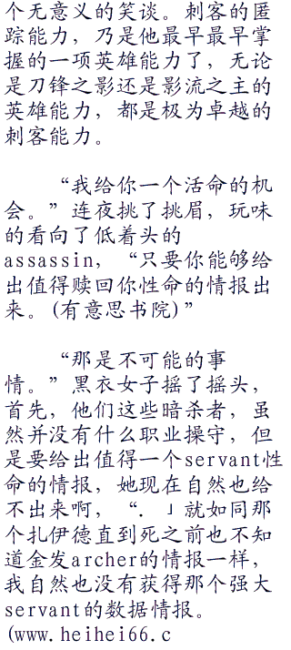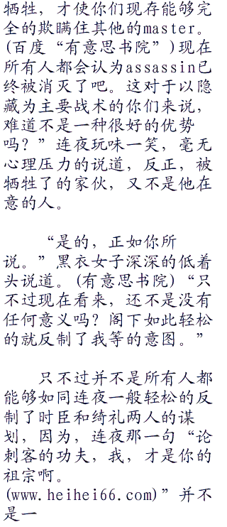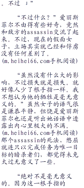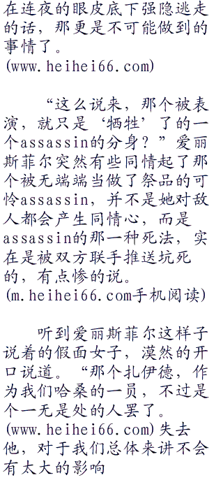 在连夜跟爱丽斯菲尔解释的时候,那个被钉出了行踪的assassin只是低沉着脸,没有尝试无用的逃跑。她很清楚,既然连夜能够在她完美匿踪,将a级的气息隐藏能力发挥到了极致的情况下尚且轻松的把她揪出了现形,那么现在她试图