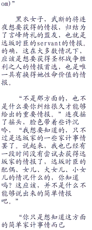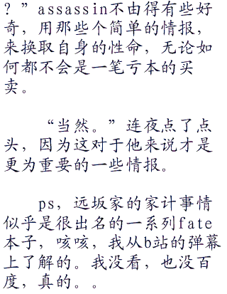 将自身的情报和一些举动毫无保留的展示在assassin的监视之下,这实在是一种极为危险的情况。不过所幸连夜把监视他们的assassin揪了出来,让爱丽斯菲尔放下了心。