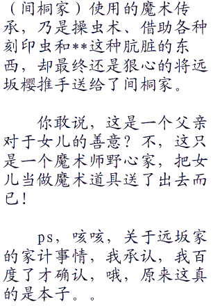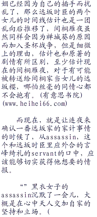 虽然他倒是很挂心有可能会出生的远坂凛和远坂樱的情况会如何,但是无论如何,让连夜每一年都去查看远坂家的所有家计事情,那也未免太夸张了一些了吧。如此的关心一个女人,倒是会让人觉得连夜的行为很是浪漫;但是如果把视线一直集中在远坂家的话,在远坂樱和远坂凛没有出世之前,只会让人觉得是个死基佬才会有的行径罢了。