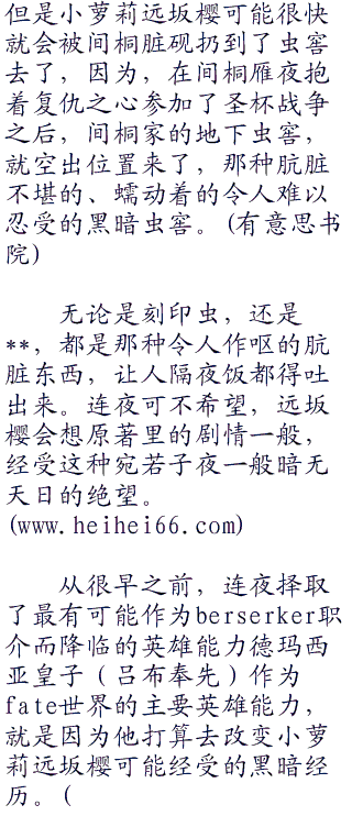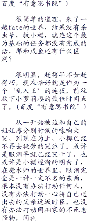 更何况,只是因为远坂凛早出生了一段时间,迥然不同的悲惨命运,就需要降临在作为妹妹的樱身上,这着实是一种好不讲理的分配结果。