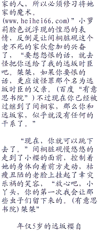 “桀桀,,都已经经历了这么久了,也应该适应间桐家的惯例了吧。”间桐脏砚微微有些兴奋的说道,露出了丝毫不像是人类一般的笑声,和夜枭一般干燥嘶哑的声音。“好了,快下去吧,樱。”