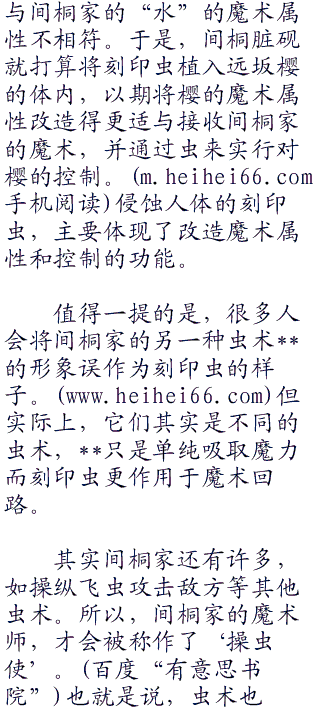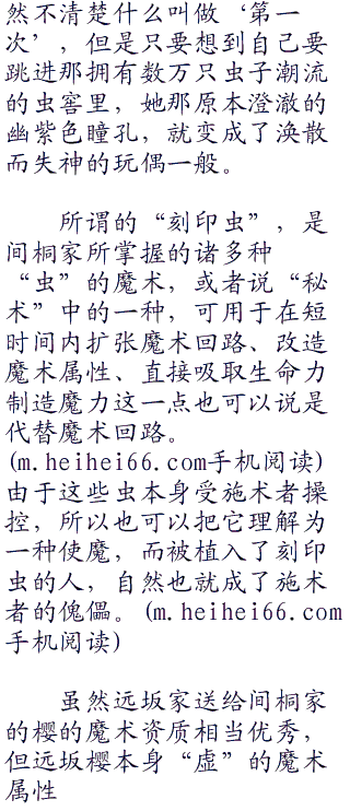 腐蚀和浊水的臭味,弥漫在虫窖四周,由刻印虫分泌出来的浊水像深海一样的墨绿黑暗。,这里,就是属于表面上光鲜亮丽的间桐宅邸,隐藏在地下室的虫窖。