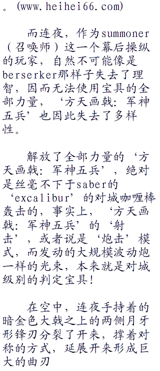 ‘方天画戟:军神五兵’,因为具有各种形态变换的缘故,被称为一个抵得上6个的超级宝具。但是原本的吕布(奉先)这个英灵因为降临现世的时候被定格为失去了理智的berserker的缘故,使得作为berserker的吕布(奉先),只能够使用‘方天画戟:军神五兵’的最低等级两个变换形式,而后面几个更为强大的变换形式在,而是无法使用