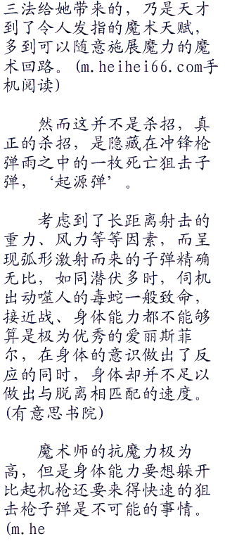 在那狙击枪的弹匣里,装载着特殊的‘起源弹’,具有用以切断魔术师至关重要的魔术回路的扭曲性弹药,效果堪称是激n激。这也是卫宫切嗣之所以被称为了魔术师杀手的原因。