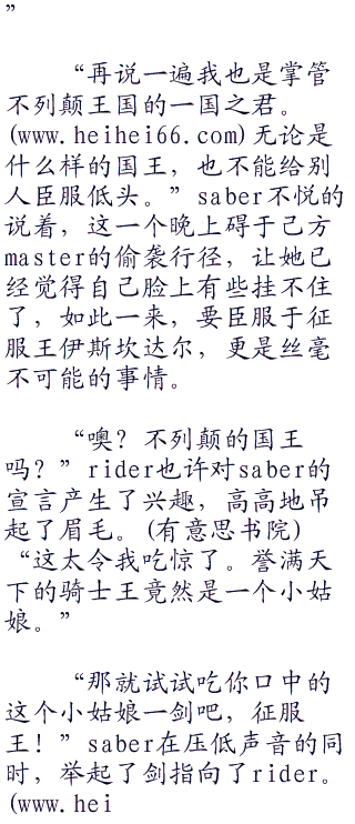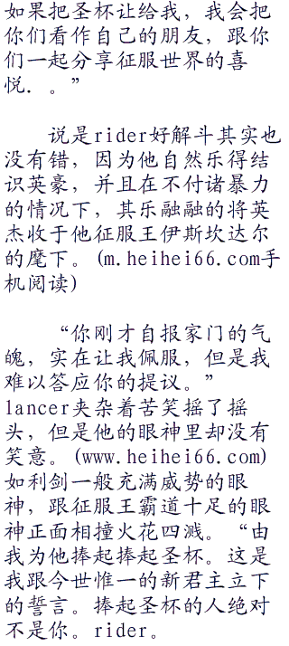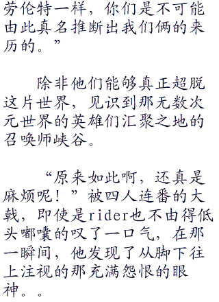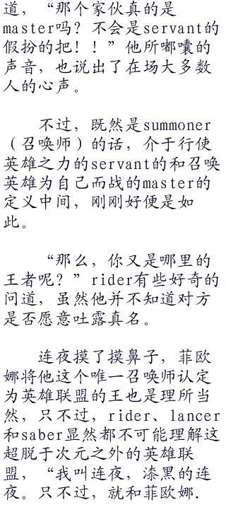 菲欧娜、lancer、saber等人都为rider的乱来之举而感到有些无语,征服王伊斯坎达尔,的确是一位不同凡响的英灵。在人类历史中,没有一个人像他那样。迫切想实现征服世界的野心。以他出名的霸道征服手段而言,说出‘生平不好斗,唯好解斗!’这句话来,简直就像是作为战斗狂的吕布说出了‘布生平不好斗,唯好解斗!’一般有些令人感到可笑。