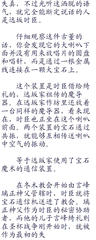 他现在使用的,是三年前的一个修行成果。远坂时臣所教授的,名为共感知觉的能力。只要通过魔法的联系,他就能和契约者共用感知器官。圣杯战争中,使用servant进行远距离监视是一项相当重要的工作。而如果自己的servant还是以打探见长的assassin,那简直就是如虎添翼了。