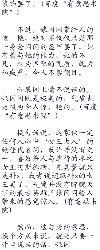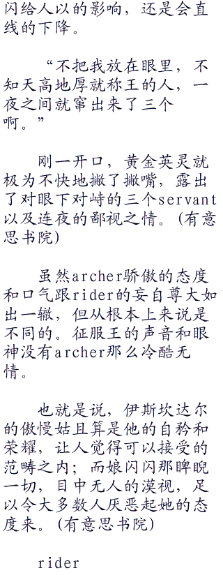 因为之前也已经通过assassin教团当中,某一只可怜的体操王子assassin的死亡,惊鸿一瞥了娘闪闪的身影,因此,如果说金闪闪是睥睨天下的女王大人,这一点尚未令连夜讶异到不可接受的地步的话,那么她背后背着的两把与鎏金色盔甲相衬的灿金曲刃长剑,就使得连夜有些难以接受了。