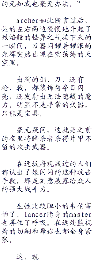 要知道,连夜之前一直都是把娘闪闪黑做了那一种只会开启‘王之财宝’,毫无方法、毫无手段、毫无技巧可言的将十八般武器宝具扔出来的2b型servant的,就是绝对力量太过强大了。但是现在看来,娘闪闪似乎并不是2b型剑士,而是‘二刀流’的好手?