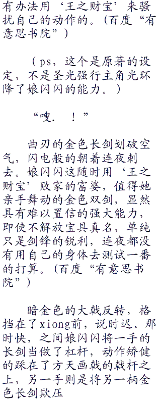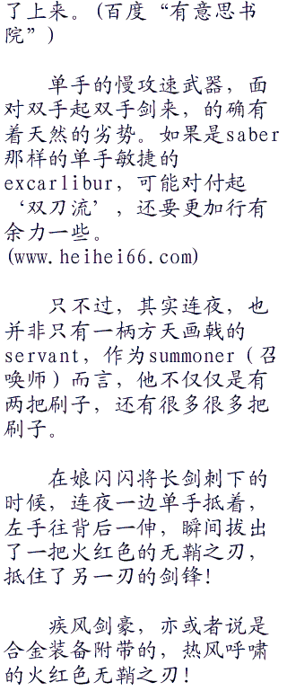 会在‘王之财宝’之后,将这两柄双剑当做了自己赖以为豪的武器,显然可以得出娘闪闪对于这两把对称性双剑的驾轻就熟。