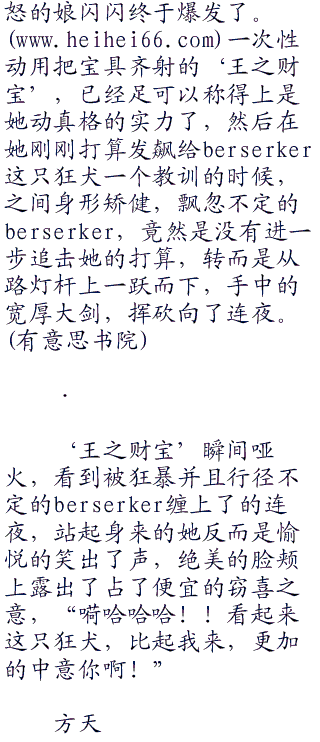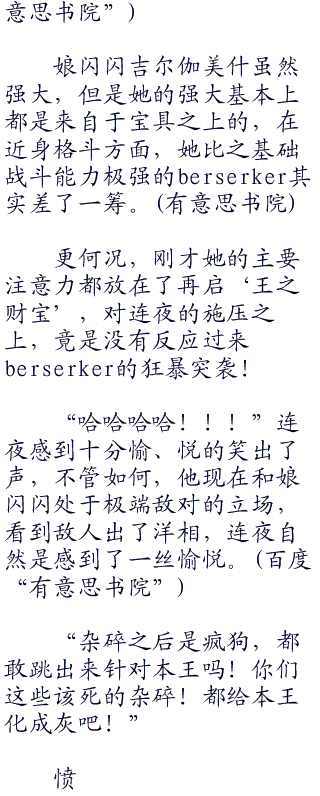 看到刚刚一显形就明确的朝着自己和娘闪闪所处的战场乱入冲锋的berserker,连夜脸上浮现了玩味的笑容。他很清楚,娘闪闪要遇上麻烦了!