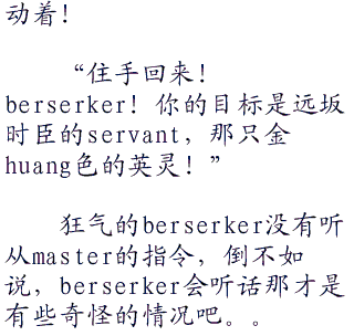 全覆式的连体甲胄,让人看不清楚她的面容。但是毋庸置疑的是,berserker的职介只有可能由代表间桐家出战的间桐雁夜召唤出来。