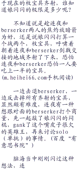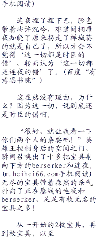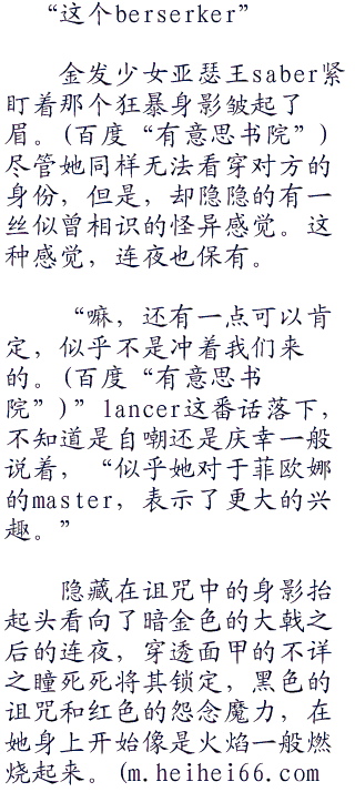 雁夜在心底呼喊着berserker,传递着他的担心和焦虑。如此简单的指示,由雁夜蹩脚的媒介魔术,都可以轻松的发出,容易的传到berserker那里,但是灰白色甲胄的狂骑士没有任何反映,依旧狂暴的侵袭着不应该成为攻击对象的连夜!