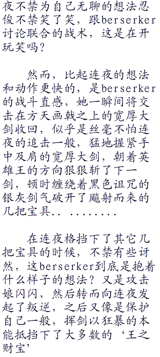 本来berserker就是战场的狂犬,具有狂暴的战斗力,以及,相当乱来的战斗方式。