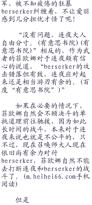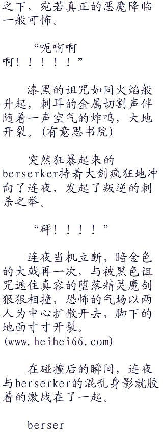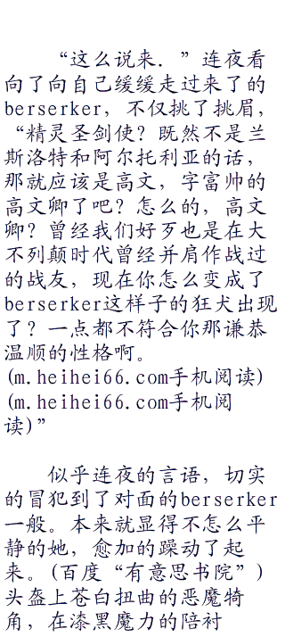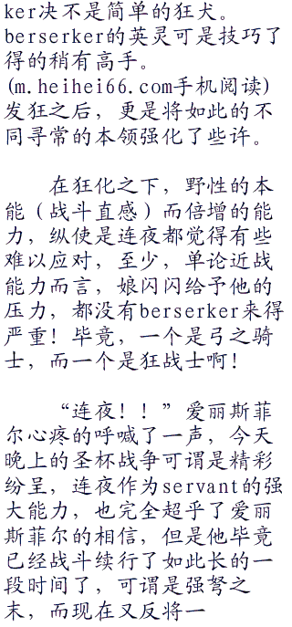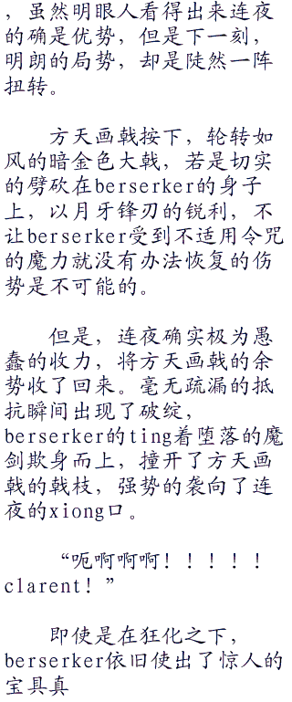 然而令连夜感到费解的是,当现在静下心来思考berserker的身份的时候,连夜却发现,她手中的那一把宽厚的被污染的精灵圣剑,丝毫不像是以‘兰斯洛特’之名而著称的圆桌骑士,所掌控的那一把‘无毁的湖光’。同样是精灵圣剑,就算是被漆黑的魔力狂化污染了,也是有所区别的。