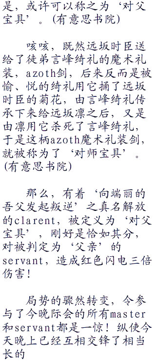 clarent,‘灿然辉耀的王剑’,这本来是与华贵的天选王者之剑,caliburn同名的姊妹圣剑。caliburn代表荣耀之金(坷垃),clarent代表的则是丝毫不逊色于金的银色之魂,银(他妈)。